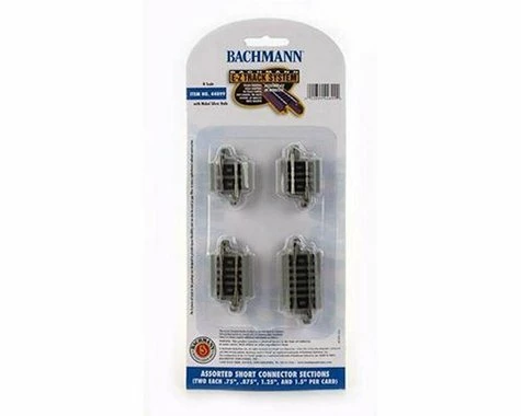 This a fifty pack of N Scale Bachmann Assorted Short Connector Sections. Nickel silver track with gray roadbed. Two of each: 0.75″, 0.875″, 1.125″ and 1.5″ per card. The 8 pieces of track in this package are designed to provide layout flexibility and can also be used as gap fillers in more sophisticated railroad construction.