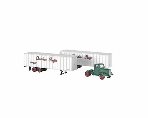 This is a HO Scale Bachmann Canadian Pacific Green Truck Cab & 2 Piggyback Trailers. Trailers also fit our HO scale 52.5′ Flatcars.