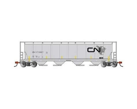 The Bachmann HO Scale CN North American Logo 4-Bay Cylindrical Grain Hopper, a detailed model of the impressive train car, with die-cast features. The undercarriage, interior and exterior have all been made with attention to detail, with text printed down the side for scale authenticity. This train best performs on a 22″ radius curves or greater.