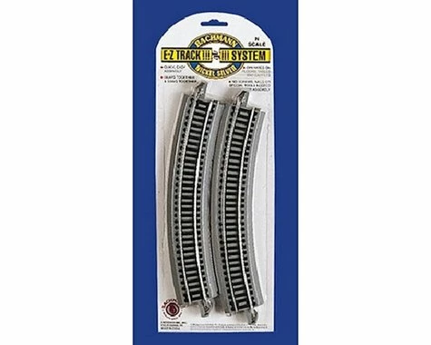 This is a pack of six Bachmann E-Z N Scale 19″ Radius Curves. 19″ Radius Curved Track is best used to make relatively wide railroad curves. This track accommodates longer locomotives and rolling stock, and permits mainline operation at higher speeds. The 6 pieces of track in this package make up one-quarter (90 degrees) of a 38″ diameter circle (a full circle is 360 degrees).Â