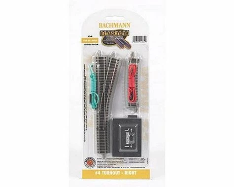 This is a N Scale Bachmann E-Z #4 Right-Hand Turnout. Compared to E-Z Track Remote Turnout – Right (Item No. 44862), this #4 Turnout – Right allows for smoother transitions between tracks during switching operations. This turnout is electrically gapped to meet the DCC specifications of the National Model Railroad Association (NMRA).