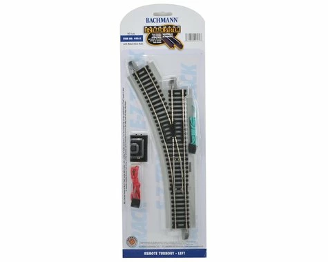 This is a HO Scale Bachmann E-Z Track Remote Left-Hand Turnout. This is the basic turnout of the E-Z Track system with a turnout radius matching 18” Radius Curved Track. If you have enough room, you may consider larger E-Z Track turnouts to allow for smoother transitions between tracks during switching operations, and to accommodate locomotives and rolling stock with longer wheel bases.