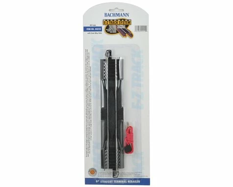 This is a HO Scale Bachmann E-Z Track Steel 9″ Straight Terminal Rerailer with Wire. The terminal rerailer is connected via terminal wires to a power pack, which provides current to power the layout. In addition to making power connections, the terminal rerailer is designed to correct derailments that sometimes occur during normal railroad operations. It can also be used to help properly align wheels on the track when assembling a train for operation. If you want to use the rerailer to help place cars on the track, you should install it so that it is easily accessible. Otherwise, it should be installed after a difficult section of track (turnout, crossing, “S” curve, etc.) where derailments may occur.