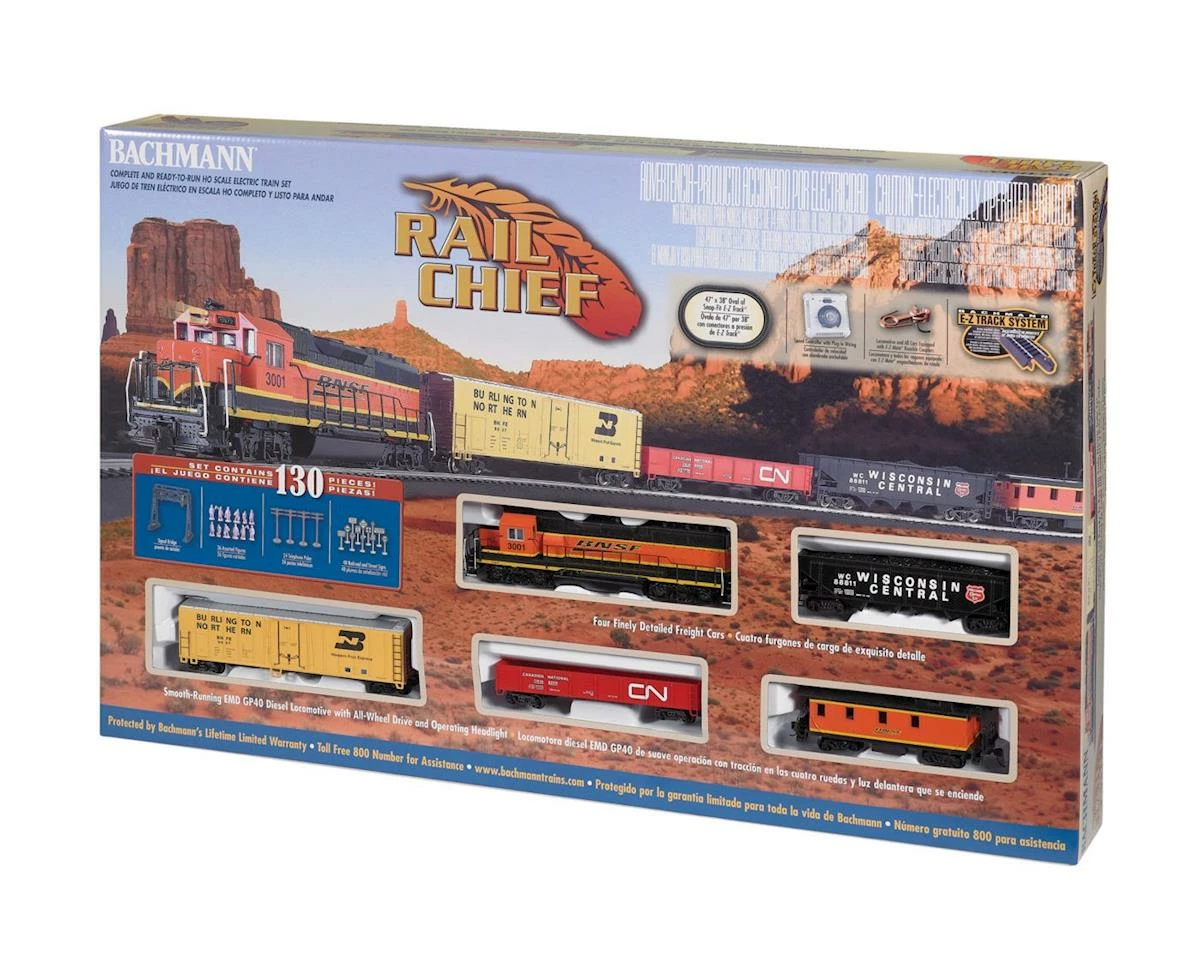 You will command the rails with the striking Rail Chief set. Complete with miniature people and a signal bridge, this 130-piece set will let you oversee your own detailed railroading empire.