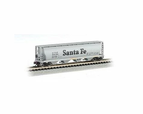 The Bachmann N Scale Santa Fe 4-Bay Cylindrical Grain Hopper, a detailed model of the impressive train car, with die-cast features. The undercarriage, interior and exterior have all been made with attention to detail, with text printed down the side for scale authenticity.Â