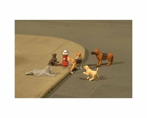 This is a pack of six O Scale Bachmann SceneScapes Dogs with Fire Hydrant. Populate your layout with miniature figures from all walks of life.