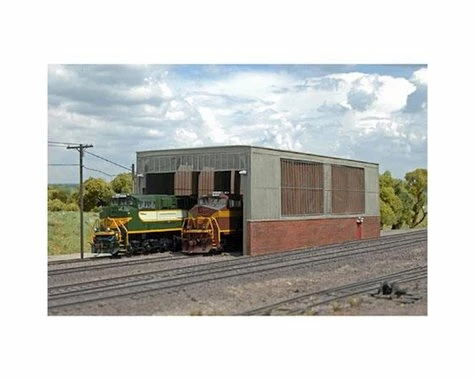 This is a HO Scale Bachmann Scenescapes Double Stall Shed. Add a realistic dimension to your layout with these mixed metal and/or resin industrial and residential buildings. Scenic elements not included.