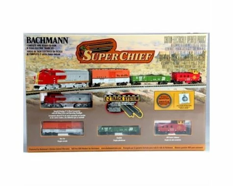 This is the Bachmann N Scale Super Chief Set. With the pride and power of a born leader, the mighty Super Chief thunders along the rails. Spearheading the charge is an F7-A diesel locomotive with the Santa Fe’s distinctive red and silver “war bonnet” paint scheme.